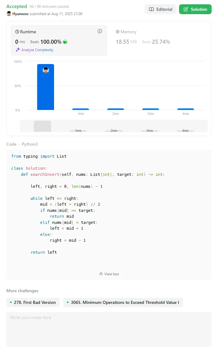 Repeating this process progressively narrows the search range until left > right, at which point the loop terminates. Thanks to the maintained invariants, left will now indicate the earliest position where the target can be inserted while keeping the list sorted (the lower bound). Therefore, if the target exists in the array, its index is returned; if not, the insertion position is returned. Because the search range is halved in each step, the time complexity is O(log n), and since it uses only constant extra memory, the space complexity is O(1).