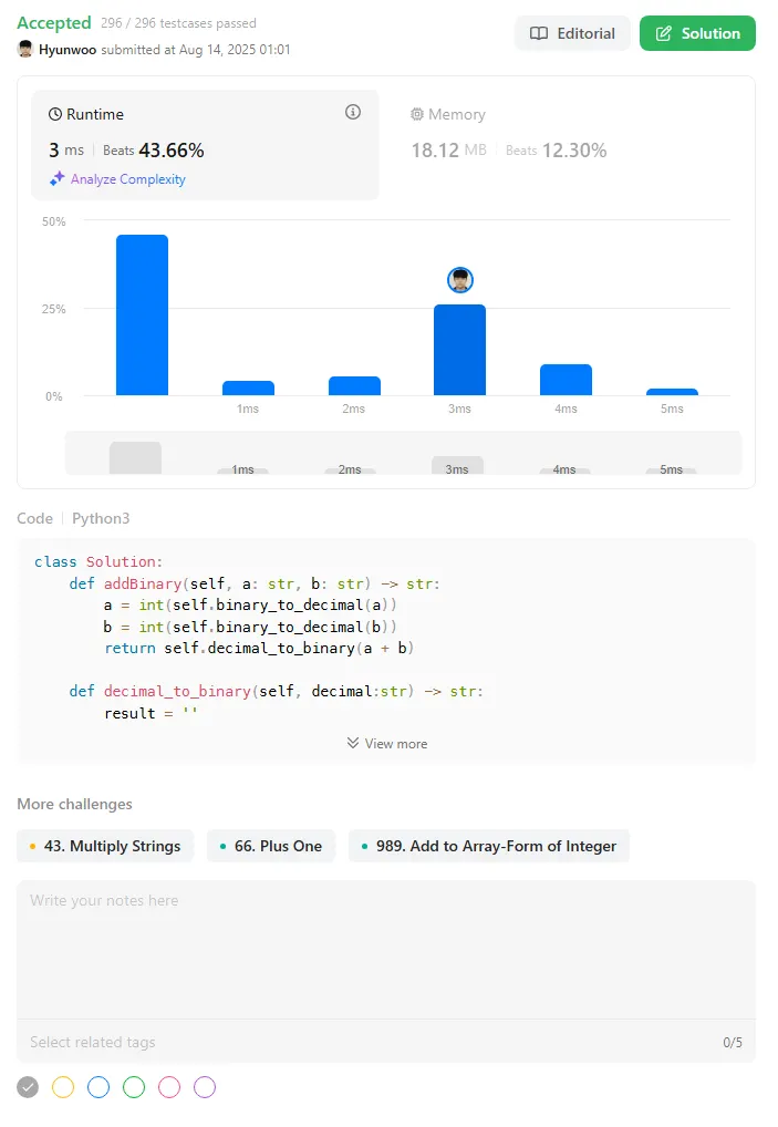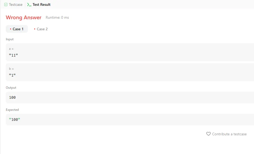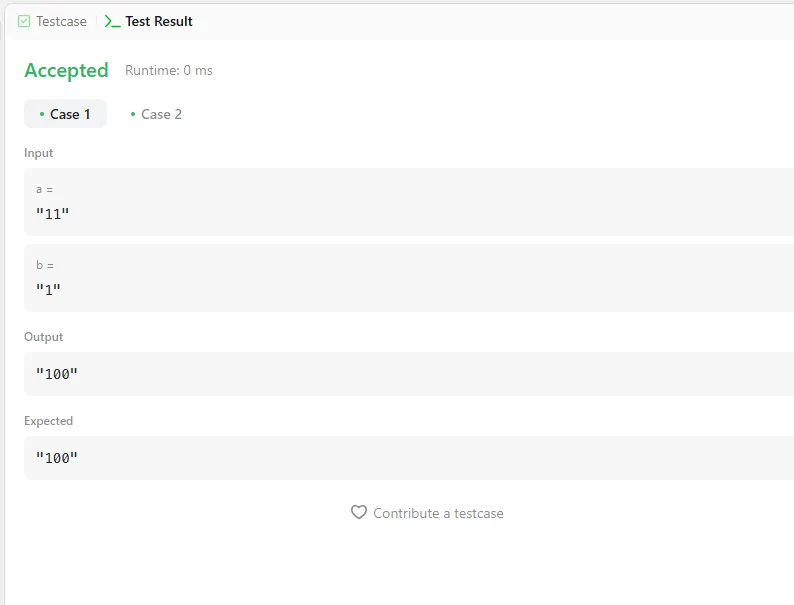 At first, when I read the problem, the idea that came to mind was to convert the two binary numbers a and b given as parameters into decimal for easier calculation, add them together, and then convert the result back into binary. Of course, this is not the most computer-efficient approach, but since this was the idea I came up with, I decided to give it a try.