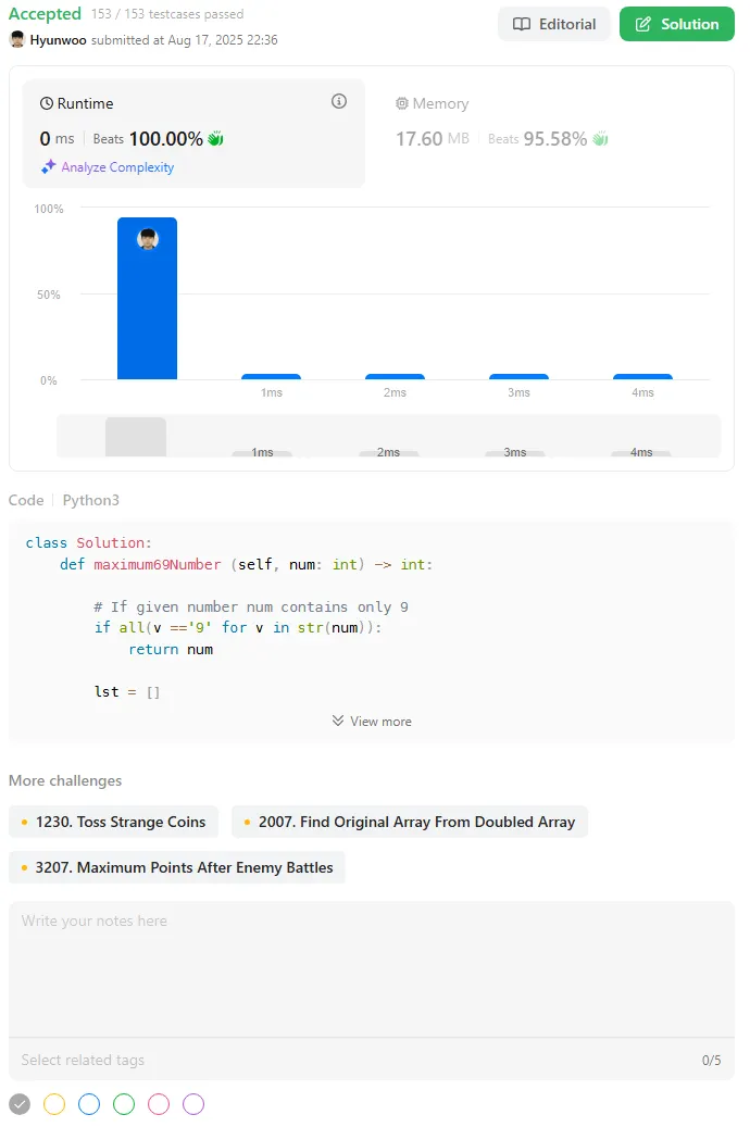 When I read the problem, it seems to ask for the largest number among all possibilities that can be obtained by changing at most one digit in the given number num. The digit can only be changed from 6 → 9 or 9 → 6.