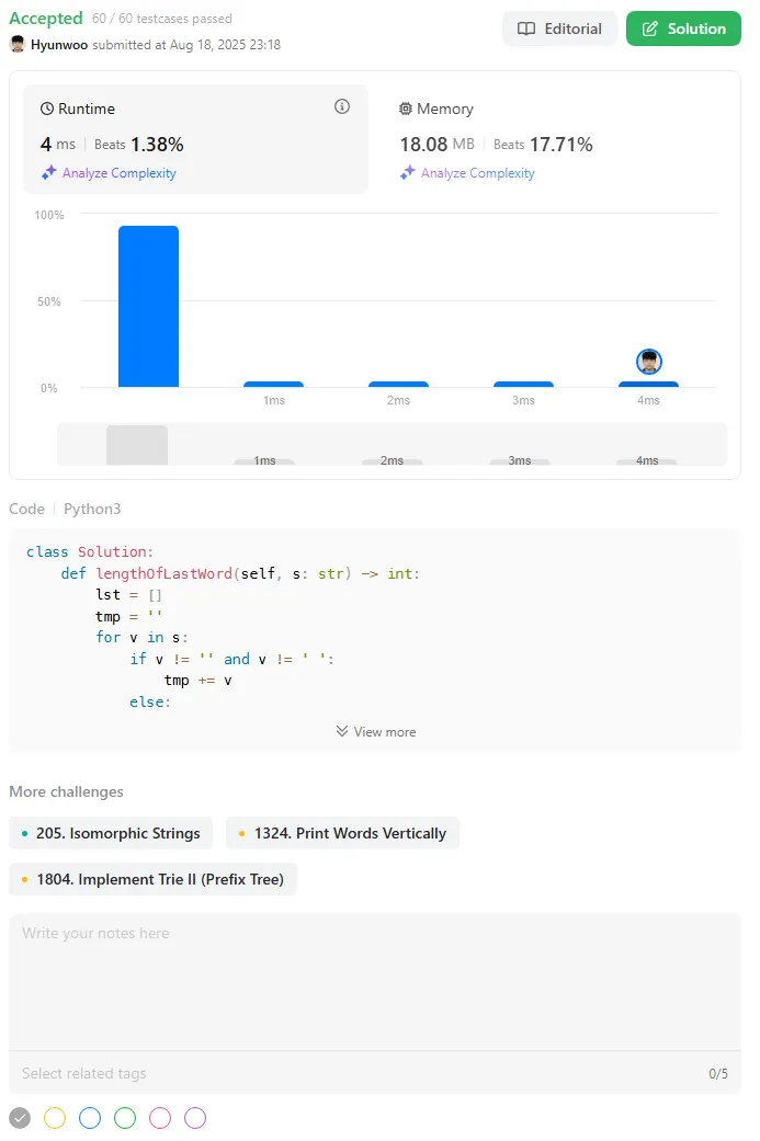 My idea is to first iterate through the string s, collect only the non-space characters into a separate array, and then return the length of the word at the last index of that array. Since I’m solving this in Python, using the split() function would be more convenient, but I wanted to try solving it without using split().