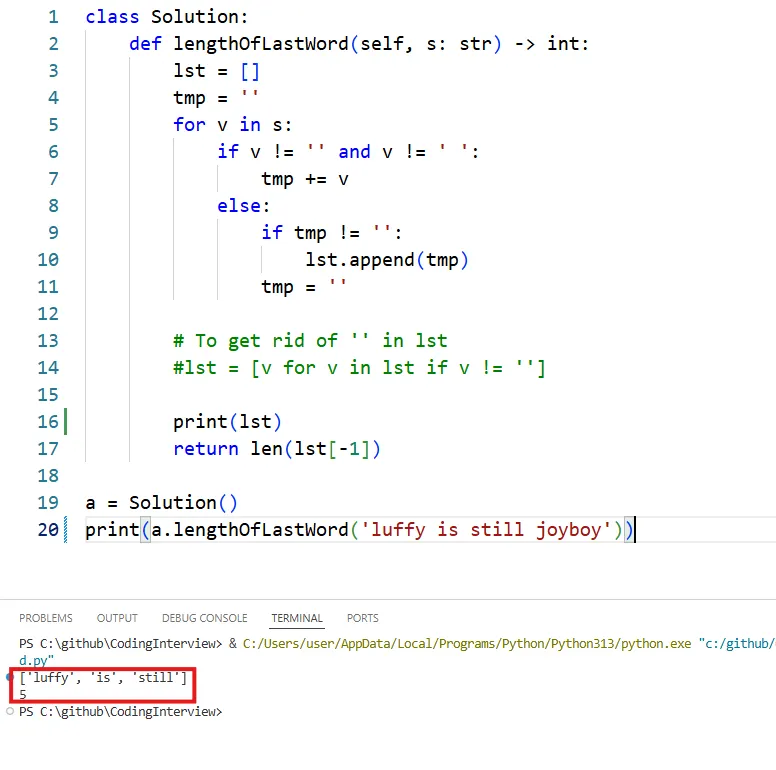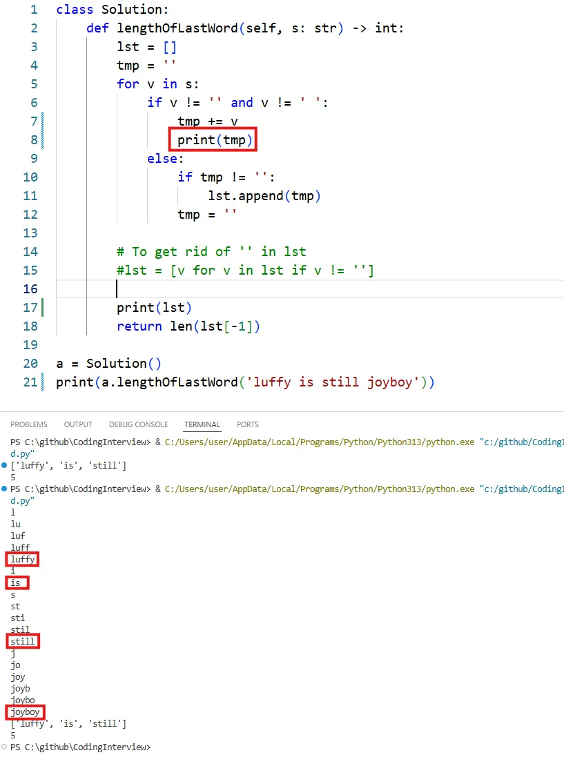 To fix this, as shown in the code below, you should add one more check after the loop ends to append tmp to lst, so that the last word joyboy will also be included.