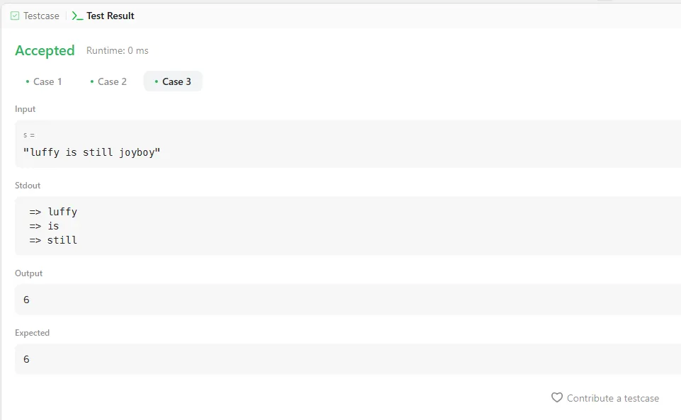 I wrote a function that iterates through the given string s, concatenates the characters excluding spaces to form words, stores them in a new array, and then returns the length of the last word.